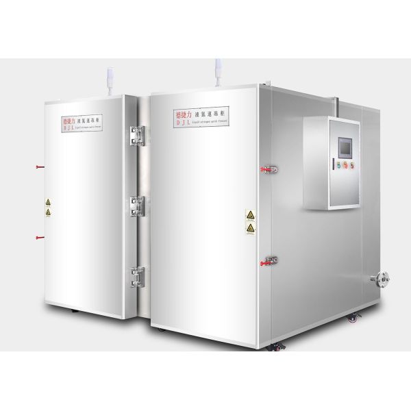 DJL liquid nitrogen cabinet iqf freezer for foods has a fast freezing speed (passes the largest ice crystal growth zone within 30 minutes, the center temperature drops below -5℃, and the diameter of the ice crystals formed is less than 100um) , great freezing effect ( No damage to the cell wall, without losing tissue fluid, maintaining the original color, flavor and quality of food), it is suitable for small and medium batch production, widely used in factories, hospitals, schools and other catering places. Small footprint.